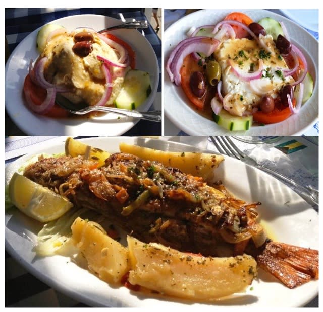 Hummus (top left), feta and olives (top right), grilled snapper marinated in lemon and spices with roasted potatoes (bottom)