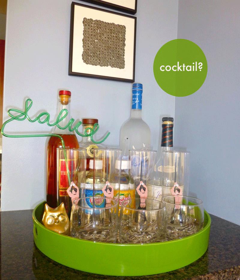 Instead, I put a bar on my bar. I have a little nook that's the perfect place. For my birthday, I received the hilarious naked men glasses and the adorable owl bottle opener. Thanks Mom & Dad! I meant to buy more than one crazy straw but didn't read the quantity selection carefully. So I have one. That says "salud". At least it's cute. Plus regular cocktail glasses for the folk who might be offended by naked bums, an assortment of booze (vodka, gin, cognac and whisky) and a few mixers. The tray is from Target and unfortunately, it's no longer available.