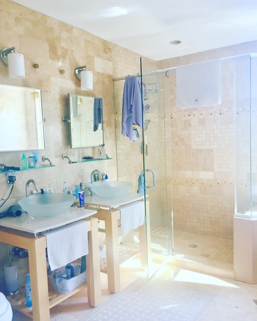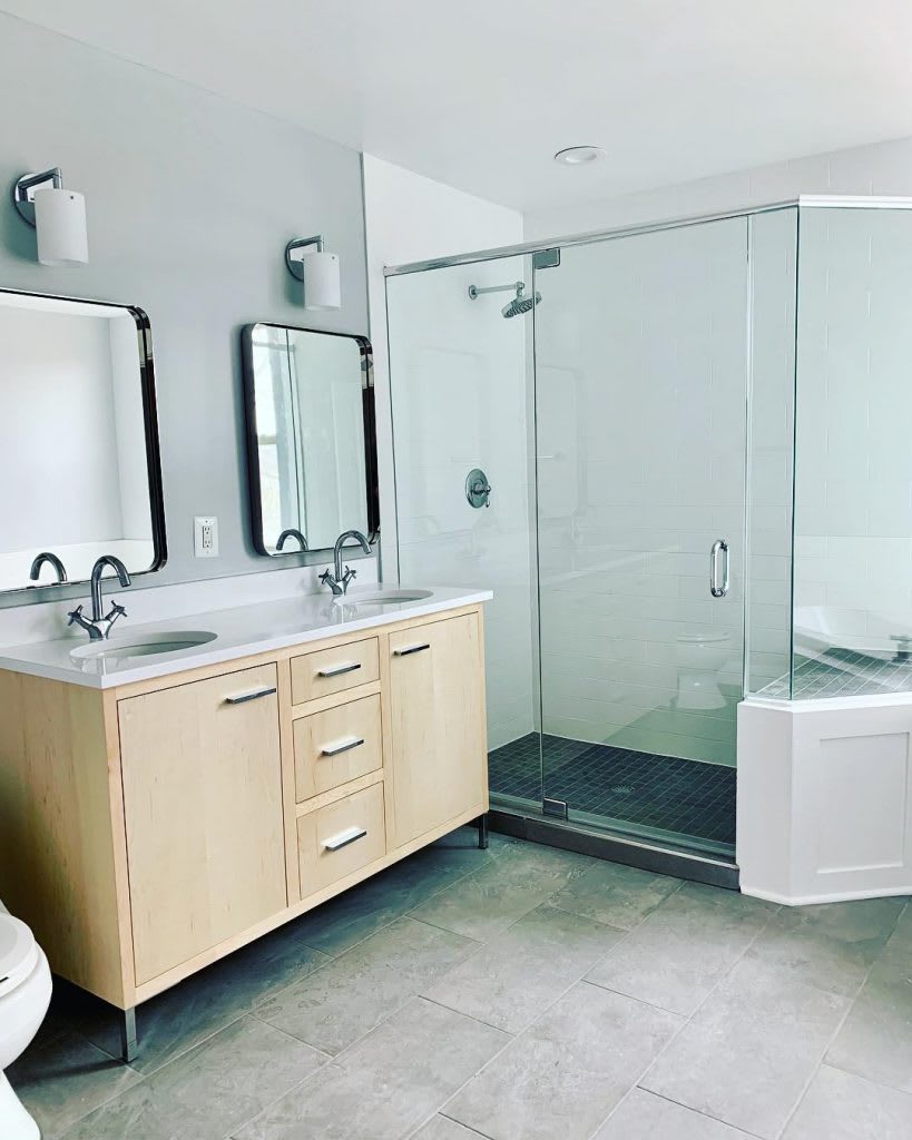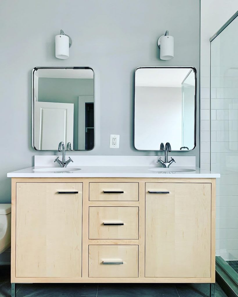 The most expensive part of the upgrade was the custom double vanity. I didn’t want to move any plumbing because it’s expensive. While the seller agreed to make upgrades, they didn’t want to spend a million dollars. The size of the vanity needed for the space wasn’t standard. I considered one vanity that wasn’t custom but it was backordered 6 months!! Instead, I had a custom maple, double sink vanity designed with a white quartz countertop. Quartz is one of my favorite materials for bathrooms and kitchens. It’s durable and it looks sleek.