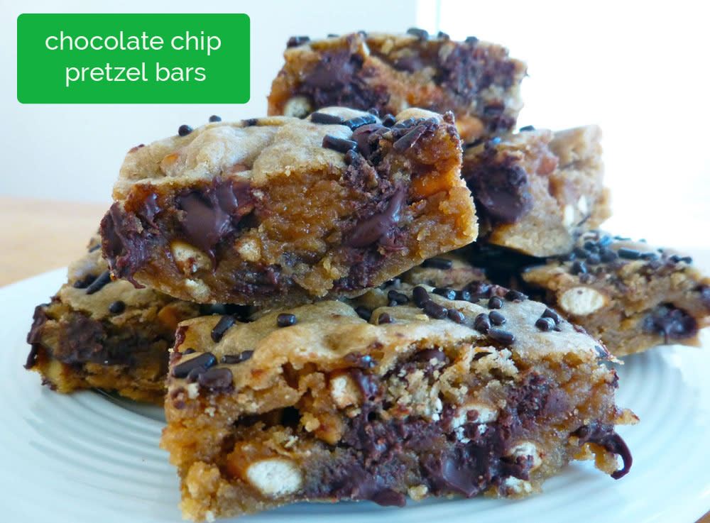 Tonight, I'm going to a bubbles and sweets party. That happens to be one of my favorite combos because there's nothing better than champagne and desserts. My contribution: these delectable chocolate chip pretzel bars. While they aren't as addicting as the salted honey and chocolate bark, they're pretty tasty. What are you doing tonight? Happy New Year!