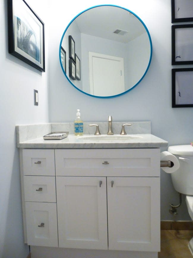 For the guest bathroom, I not only painted the cabinet white, I changed the counter top from granite to marble. It’s made such a difference! I also repainted the bathroom in Bunny Grey by Benjamin Moore and added new pulls. I love it!