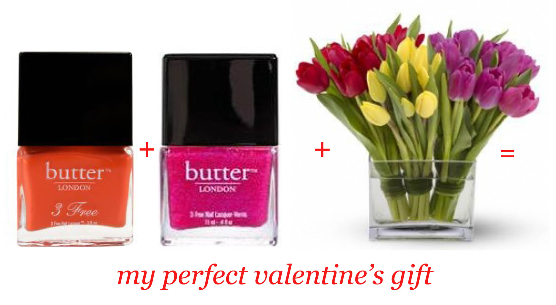 I'm not a huge Valentine's fan. My husband and I don't make a big fuss and keep it simple. Every year, he gives me tulips. Tulips are such cheerful flowers and I smile every time I see the arrangement. This year, I added two fun Spring nail polishes (have you seen Ms. Lilien's party nails??) to the mix for my version of a perfect Valentine's gift. What's your ideal Valentine's present?