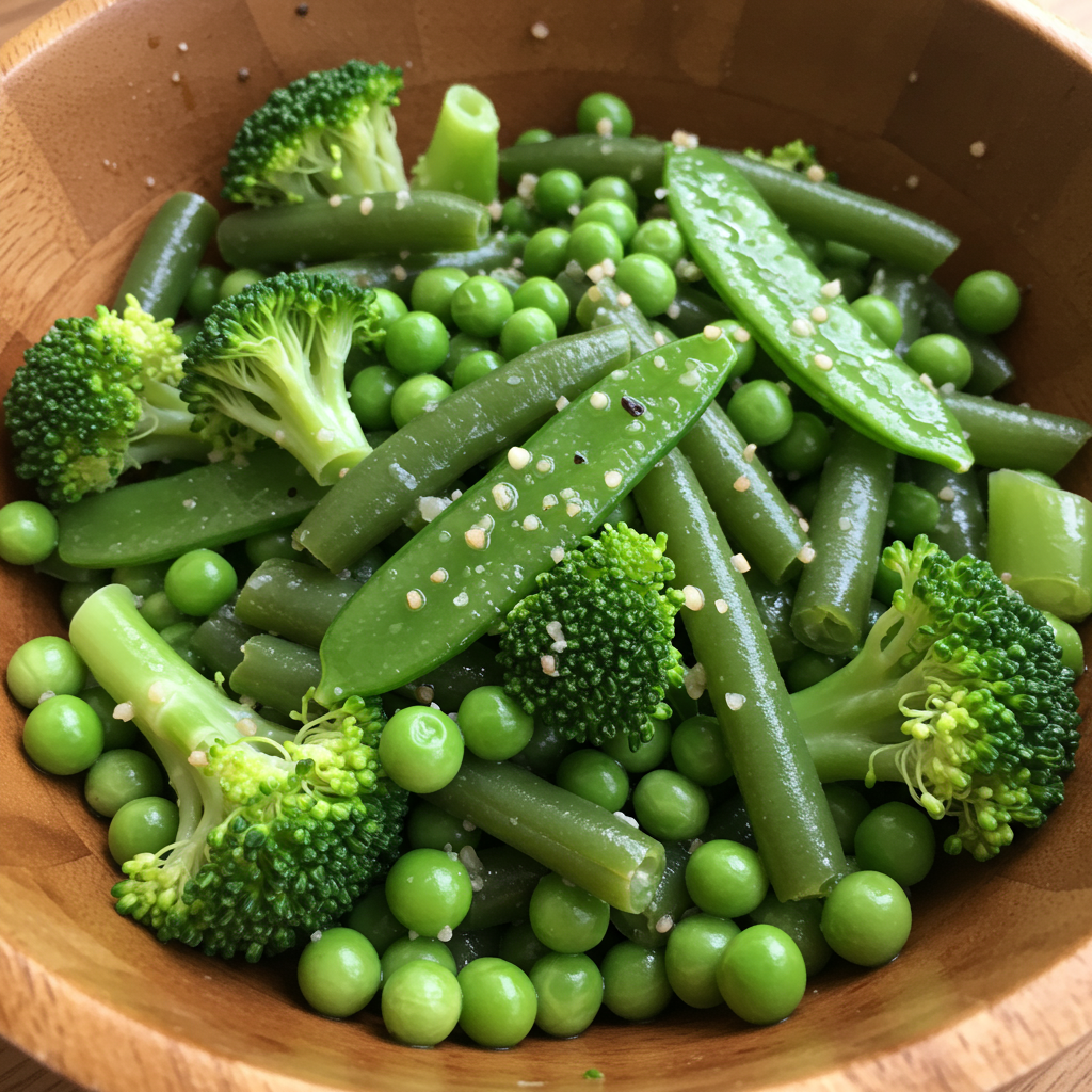 - Cook green beans, sugar snap peas and broccoli in a pot of salted water until no longer raw but still crunchy, about 2 minutes. Using a slotted spoon, transfer to a bowl of ice and let sit until cold, about 3 minutes. Drain, pat dry, and thinly slice into bite size pieces.