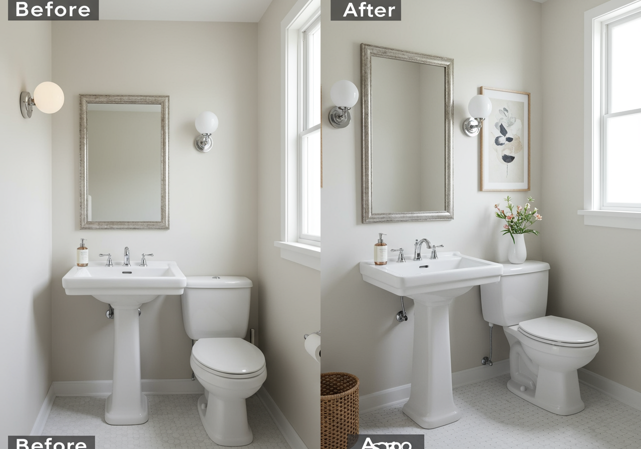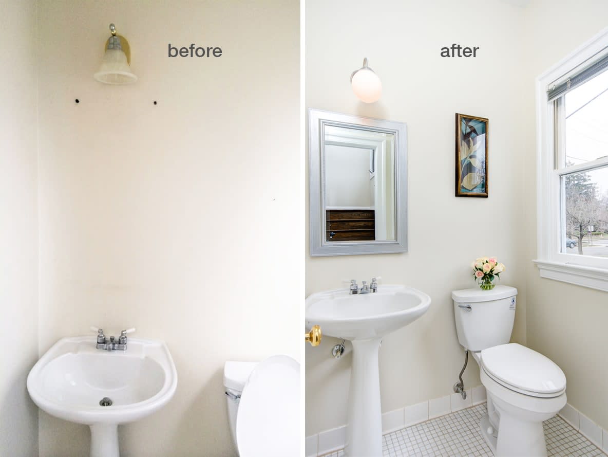 First, how much do professional photographs make a difference? Second, isn't it cute with the new mirror and light fixture? That update cost $55. I got the mirror at Homegoods. I got the light fixture from Ikea. The new homeowner is probably going to come in and redo the entire thing. As a listing agent, you want the house to appeal to everyone. Little fixes like a more stylish light fixture can make a huge impact for a little money.