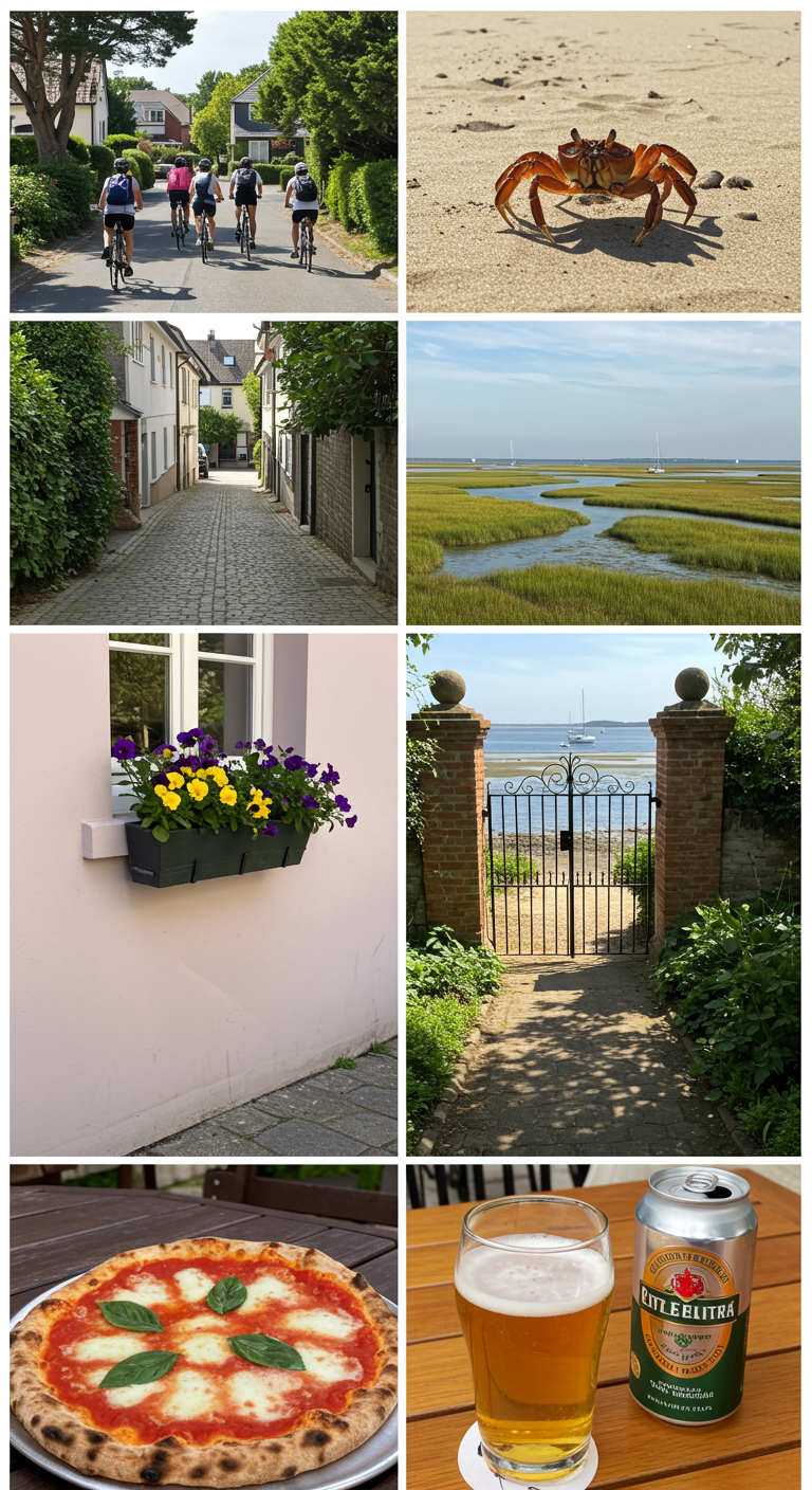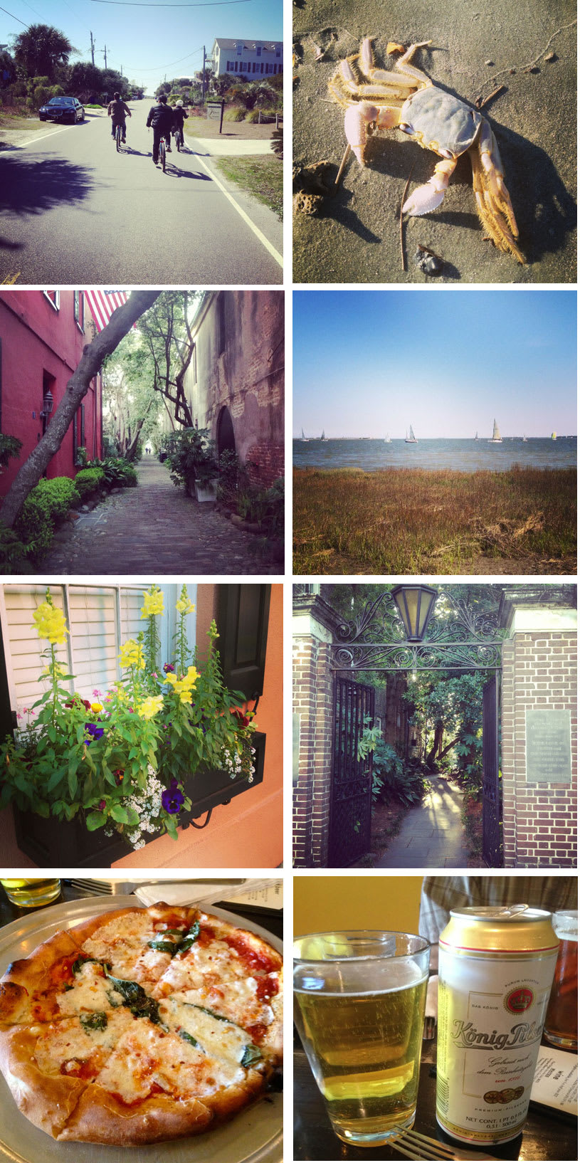 photos left to right: riding bikes in Folly, crab on the beach, beautiful street, the view from Waterfront Park, flowers in bloom, lovely courtyard, margherita pizza and beer for lunch at evo.