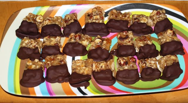 Then I made some spectacular cookies. These are chocolate dipped hazelnut caramel squares from the December issue of Bon Appetit. Yes. They were difficult. I made candied orange peel because the grocery didn't carry it. It was worth the effort because they are FANTASTIC. Happy holidays!