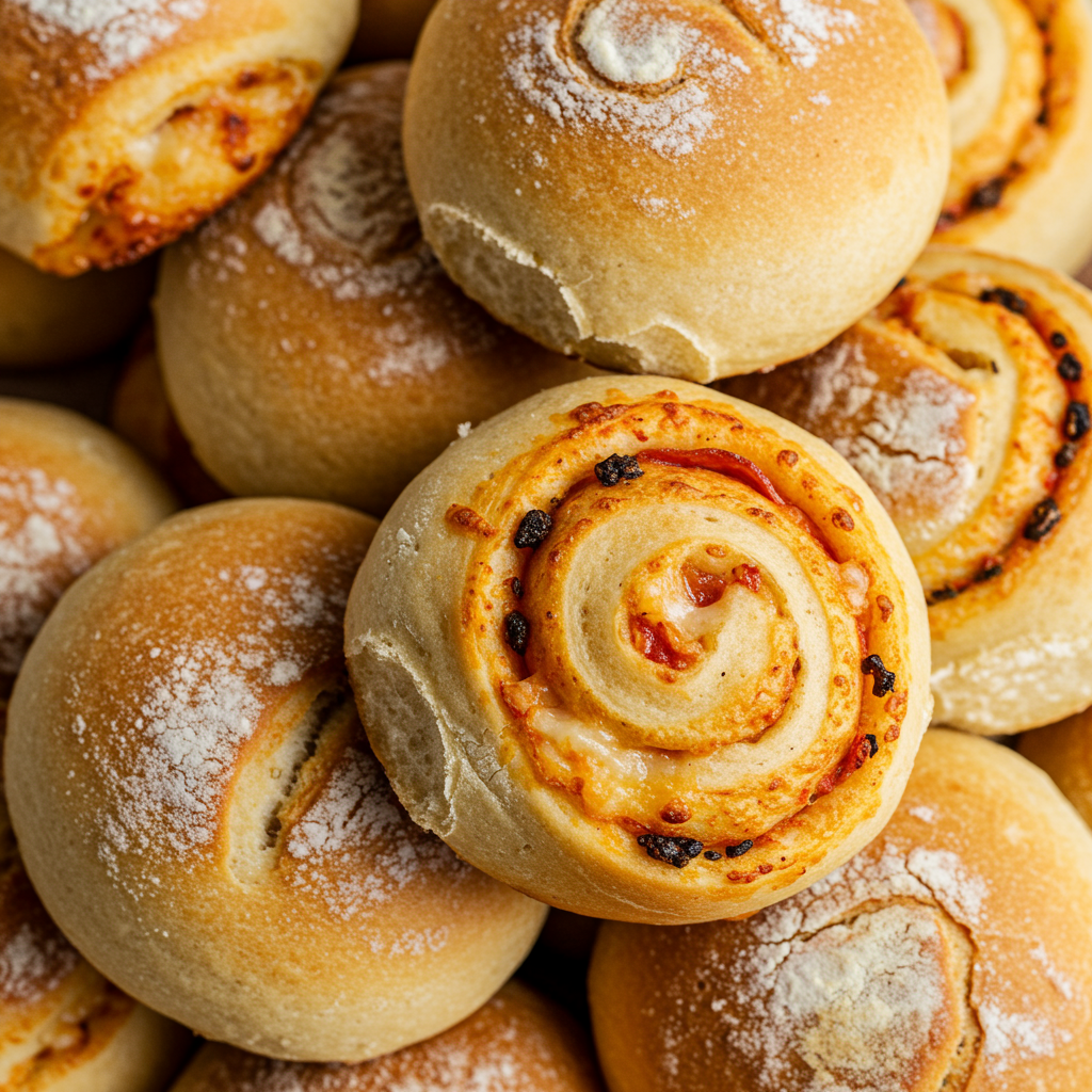 In a food processor bowl, place the flour, salt, yeast, and sugar. Mix. With the motor running, pour in the water a little at a time to make a dough that cleans the sides of the bowl. Whirl the dough about 30 times, adding a little more flour if the dough seems sticky. Take the dough out of the processor and divide into 3 oz. portions as if making rolls. Place these portions on an oiled baking sheet and put in the cool oven with a small pot of boiling water. Let the rolls double in volume (about 1 hour). Working on a cutting board, flatten each portion, add 6 to 8 slices of pepperoni. Wrap the pepperoni with the dough, close the ends and place the roll back on the baking sheet (seam side down). Place the baking sheet back in the oven and let the rolls rise until doubled in size. Again about 1 hour. It's ok if the rolls touch each other. Once the rolls have risen, bake at 350 degrees until a light brown. Turn the baking sheets in the oven for even baking. Don’t forget to take the pot of water out of the oven. (thanks for the reminder Dad!)