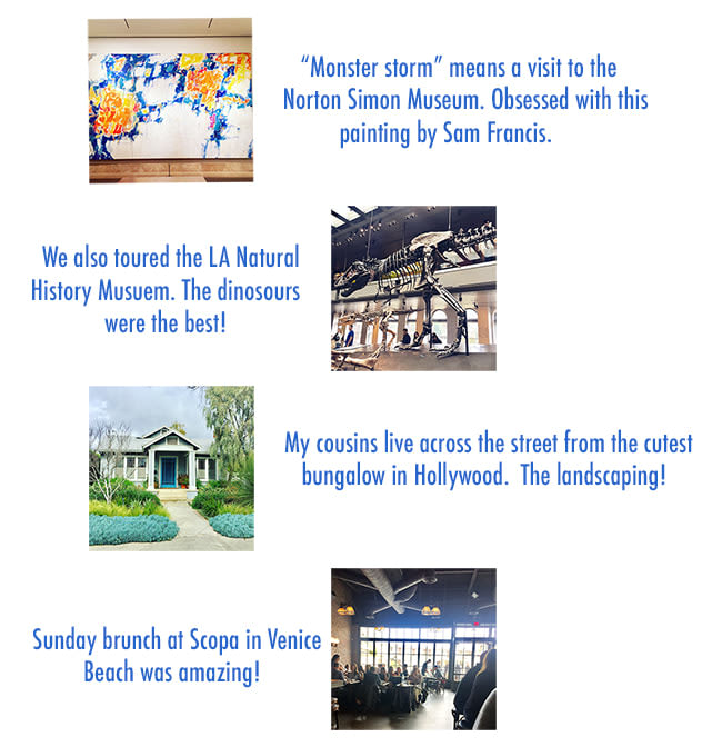 We spent a couple of days in Pasadena with my Aunt and Uncle then moved on to LA. While in Pasadena, we ate at wonderful restaurants and visited the Norton Simon Museum. The museum was incredible and had a mix of old Masters and modern art. I found a new artist that I like: Sam Francis. I’d never heard of him but I loved the “Basel Mural 2”. I wish I could recreate it.