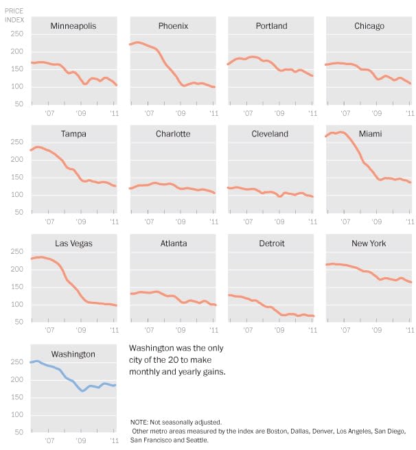Welcome to the DC market. It's unique, expensive and vibrant. It certainly isn't the same as markets in other parts of the country. Below is graphic about prices dropping through out the country…except in DC.
