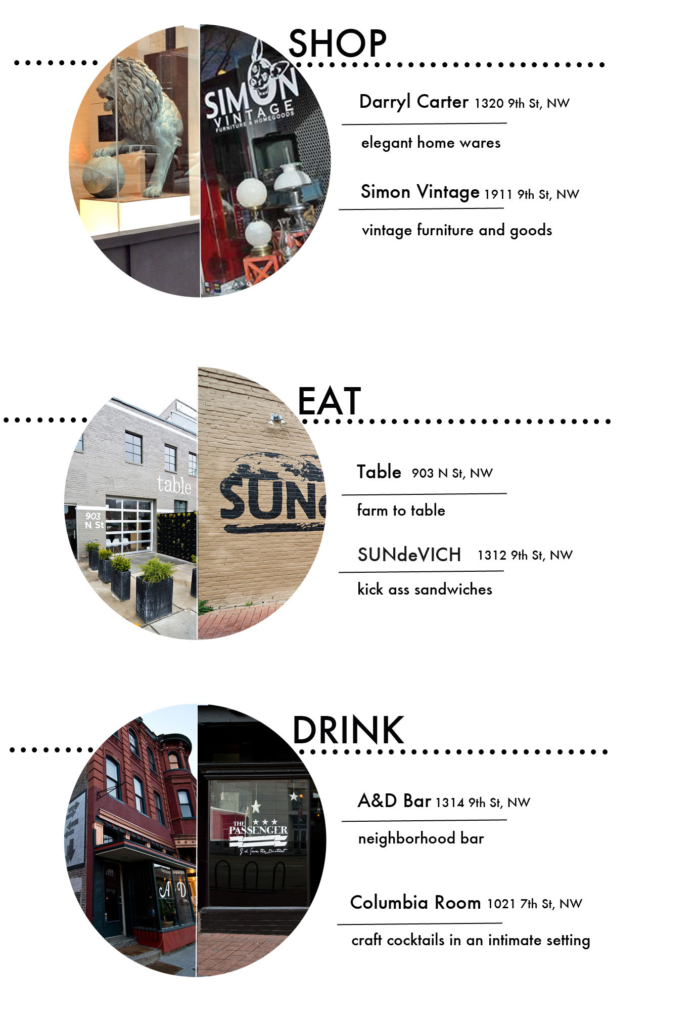 DRINK at A&D and The Columbia Room. A&D looks and feels like a dive but offers wonderful cocktails and bar food. The Columbia Room is a small, reservations only bar within a bar, serving innovative classic cocktails. It's hidden in a back room at The Passenger (another fab place to grab a drink).