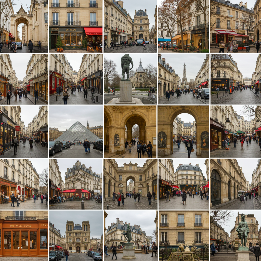 - row three from left to right: Palace des Voges, cool sign, statues outside Musee d'Orsay, Notre Dame from the river.