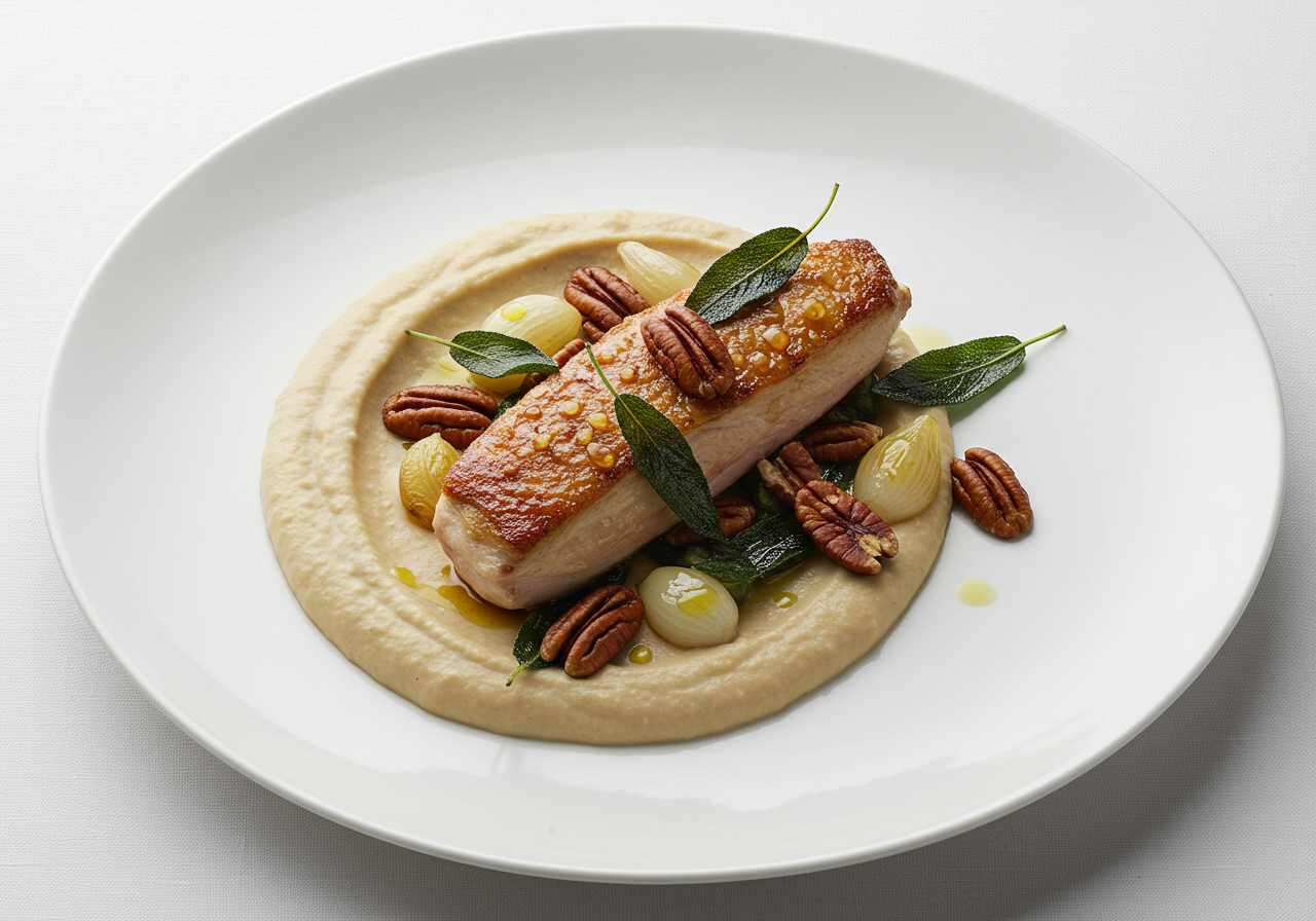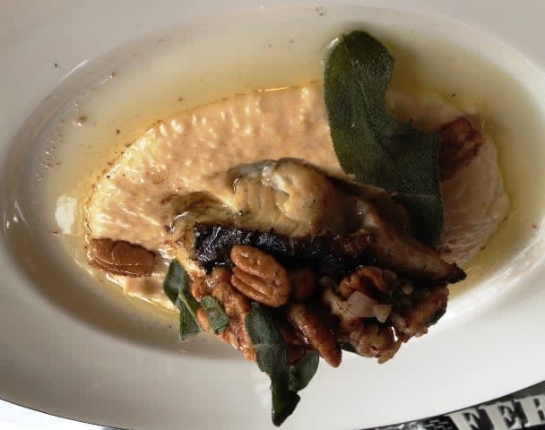 Grilled redfish on a bed of cheese grits with fried sage and pecans.