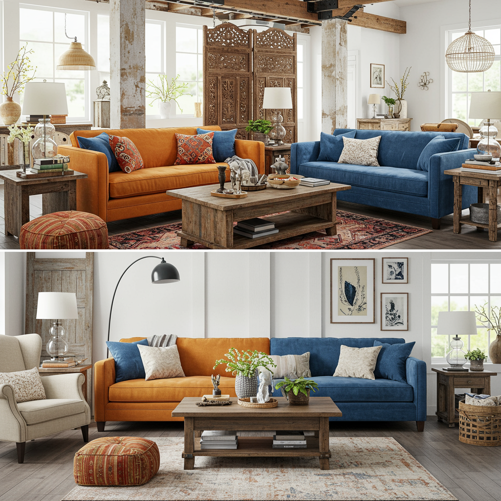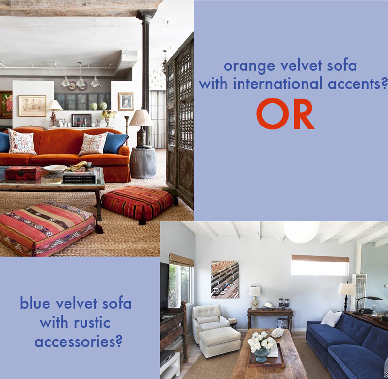 The good thing about so much space is they could easily use both of these rooms for inspiration. They already have a lot of international (for lack of a better word) influences in their house because both have traveled the world. I like the jute rugs in both rooms plus the richly colored couches. Maybe the blue couch could go in the sun room and the orange couch in the living room? There's endless possibilities.