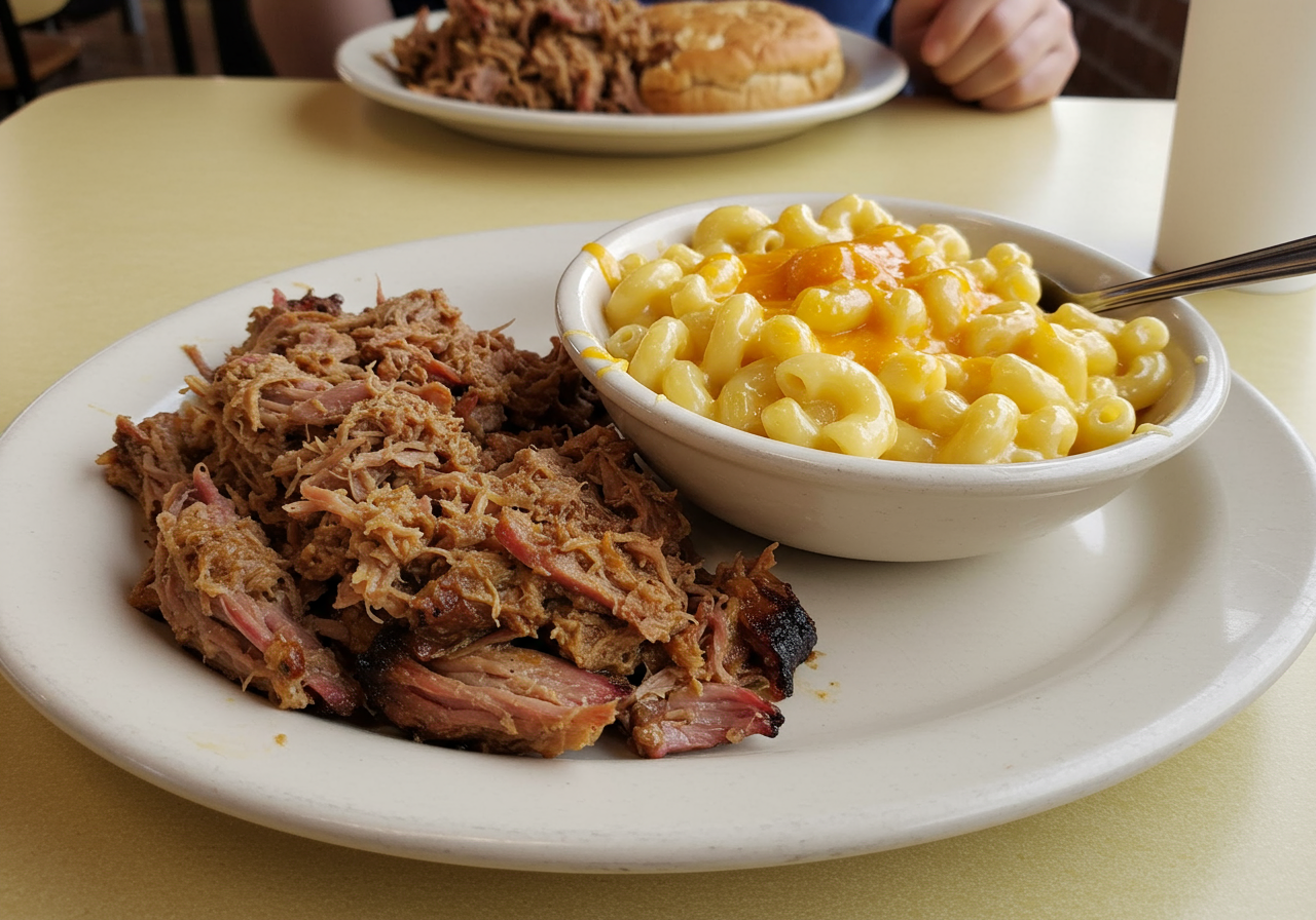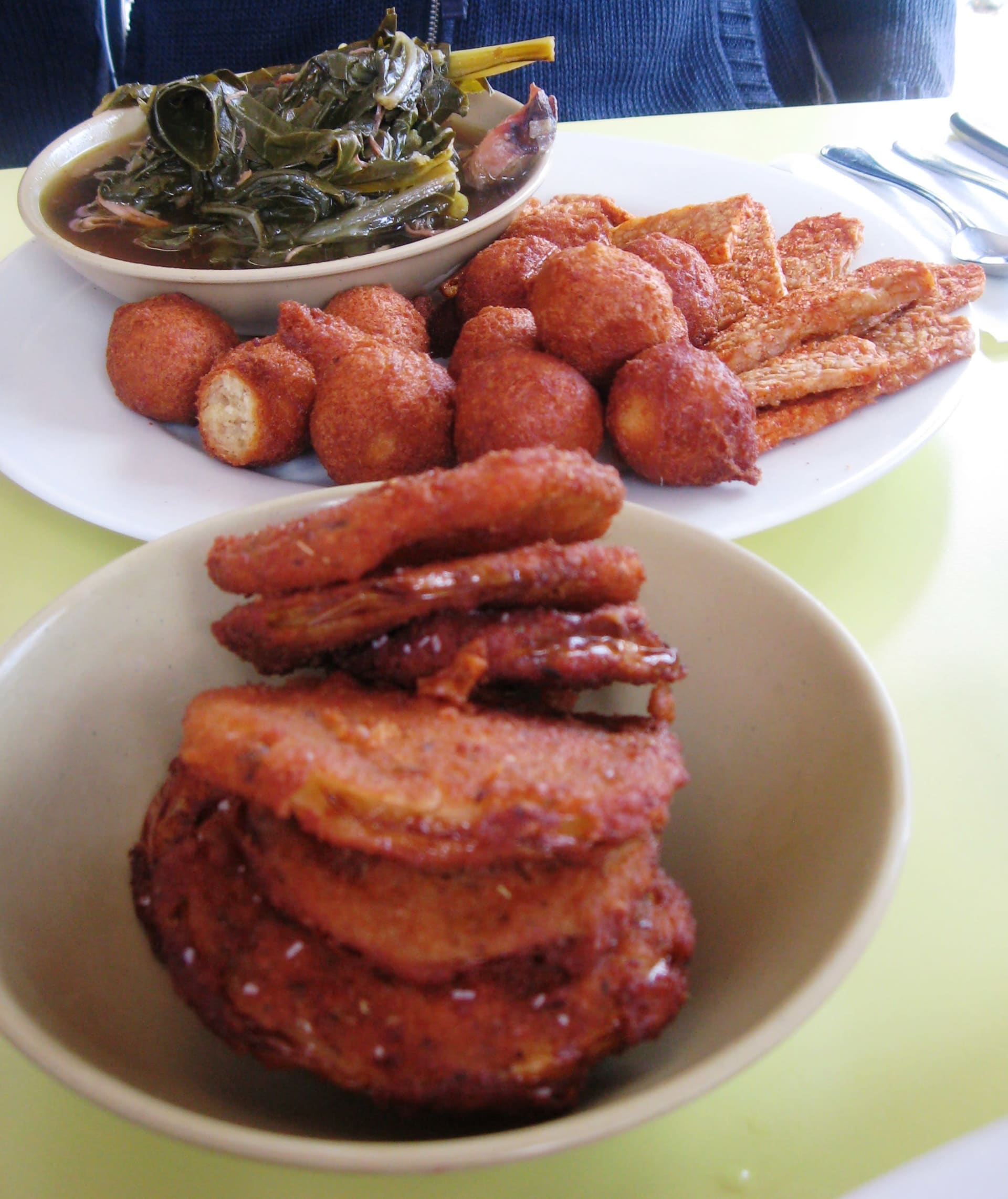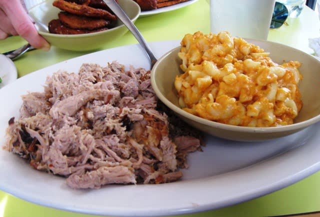 I got the large BBQ plate with two sides (picture 3). My husband ordered the large plate because he wanted to eat some of mine plus his sandwich. In addition to that monster portion of BBQ and mac and cheese, I had a salad (yum). My husband had a pork belly sandwich with slaw (which he inhaled..no pictures..again!). My cousin, who's a vegetarian, had the fried tempeh with collard greens, hush puppies and fried green tomatoes. (picture 4). I loved every bite except the mac and cheese. It looked delicious but I didn't love the smoked flavor. Everyone else enjoyed the smokiness but it didn't do much for me. The BBQ, on the other hand, was AMAZING. If you're in Chapel Hill, I highly recommend a stop at The Pig. You won't be disappointed.