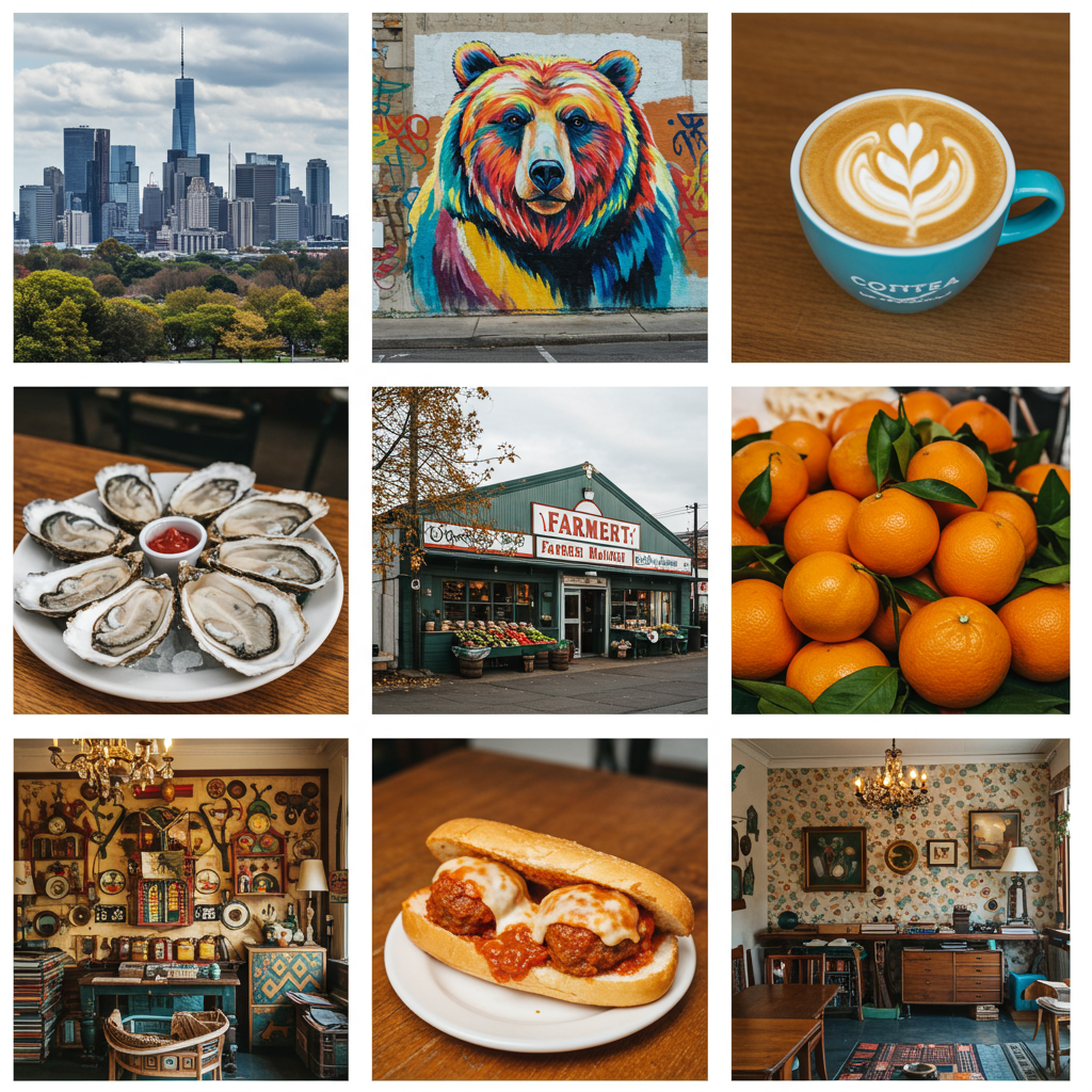 pictures left from right: view of the city from the boulevard, street art, coffee from zeitgeist, oysters with kim chee ice at matt's in the market, pike's place market, oranges at sosio's produce, display at watson kennedy, meatball sub at salumi, chandelier at great jones home. all photos via instagram.