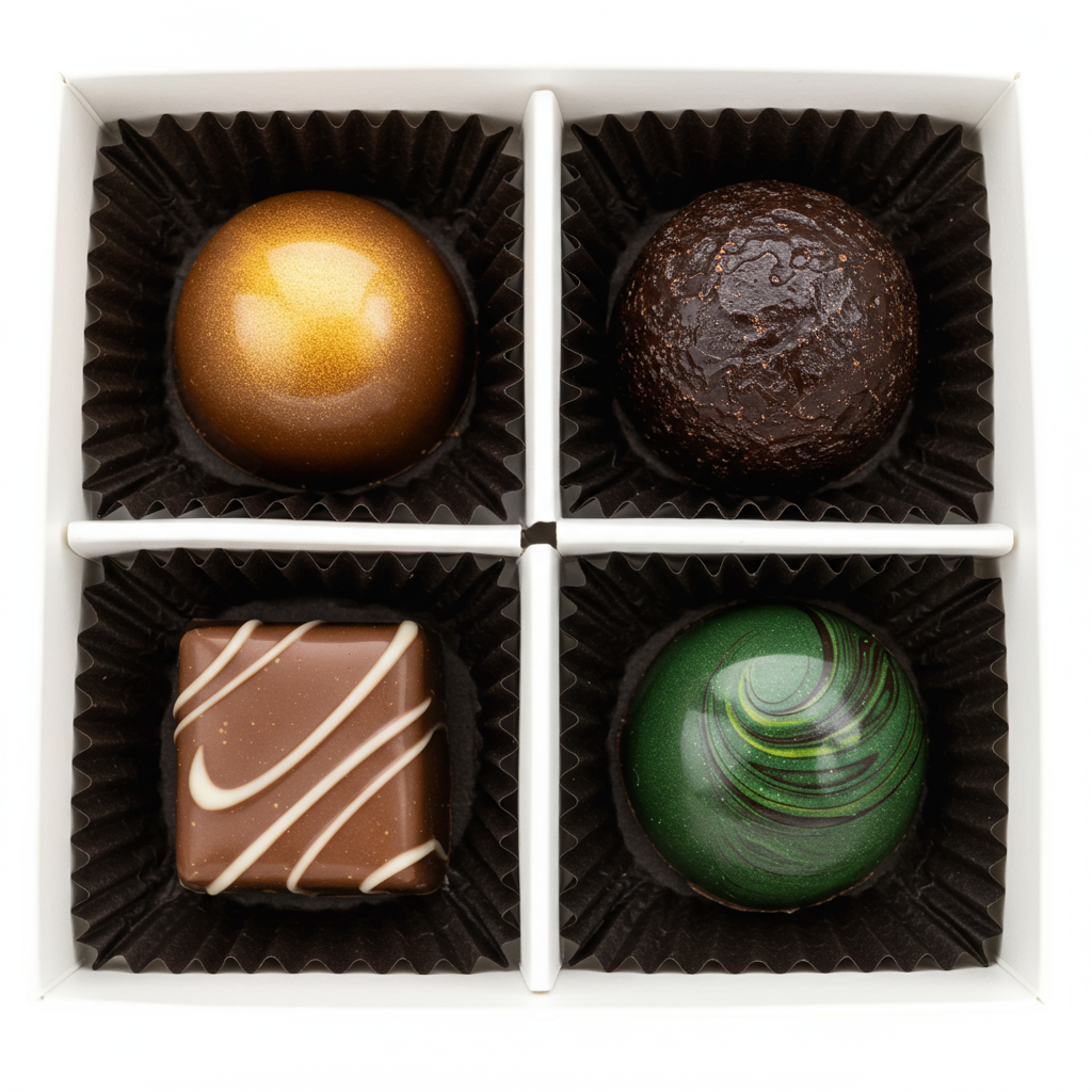 4 pack of truffles for my husband. From left to right, clockwise: burnt sugar carmel, a coffee truffle, a rosemary flavored chocolate and a whiskey flavored truffle.