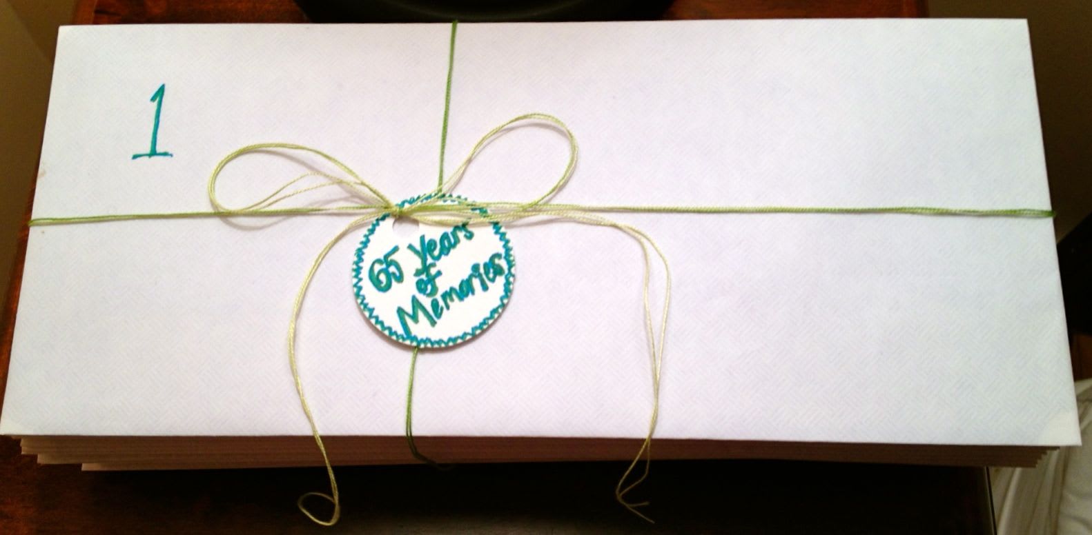 The idea was from Nothing But the Bonfires. I wrote an email to my Mom's friends, co-workers and relatives. I asked them to send (by mail and eventually email) their favorite memory of my Mom for her 65th birthday. My Mom is really sentimental. I knew this would be the perfect gift.