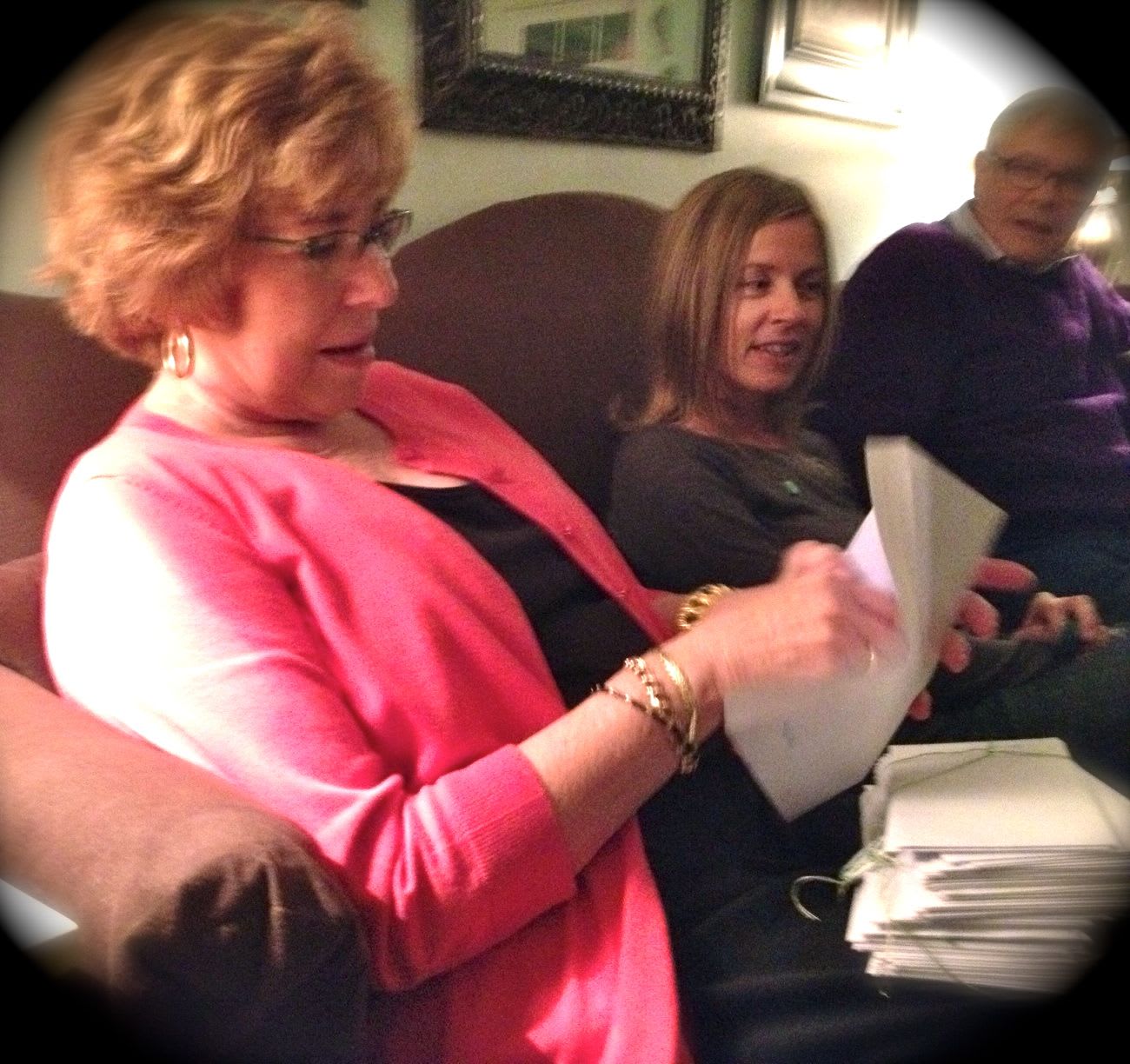 My Mom likes to have a good time. She definitely likes her wine. She's a great friend. She's hilarious. Everybody always wants to eat at the restaurants my Mom chose because they were always good. She loses her keys frequently. Last but not least, she cries. A lot. Which she did the entire night as she opened her envelopes.