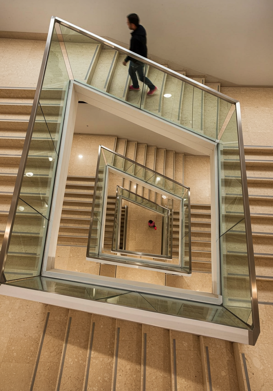 First, I had to check out the blue rooster on the new roof terrace. As you can see, it’s enormous and funny. Next, the famous I.M. Pei stairs.