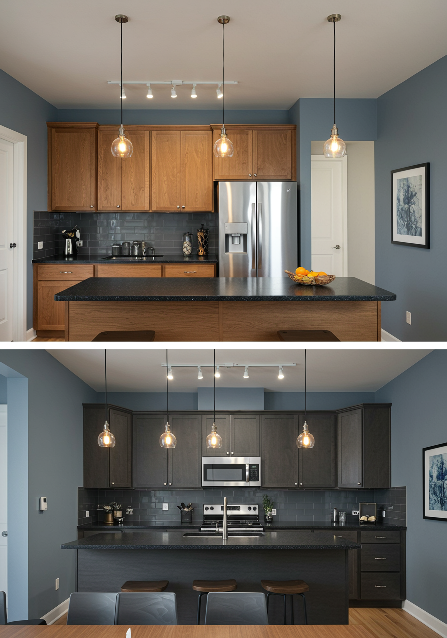 Re-painting the kitchen is an exciting prospect. While I've enjoyed my blue kitchen, it's been entertaining to imagine it with new paint. What do you think of my first attempt at changing the kitchen colors? Is it too dark? Should the cabinets be a lighter grey? Is it too one note? Do you even like the kitchen cabinets a different color? Opinions, please!