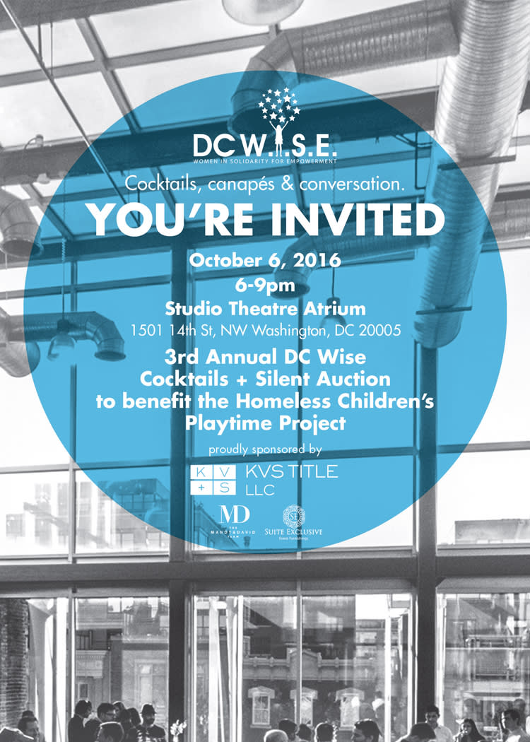 Tickets for the 3rd Annual DC Wise Cocktail Party and Silent Auction are officially for sale. DC Wise is offering a $65 early bird special till Sept. 9th. This year we’ve upped the ante: full open bar, heavy hors d’oeuvres and an extra hour of fun. Go to our event page and buy tickets today!