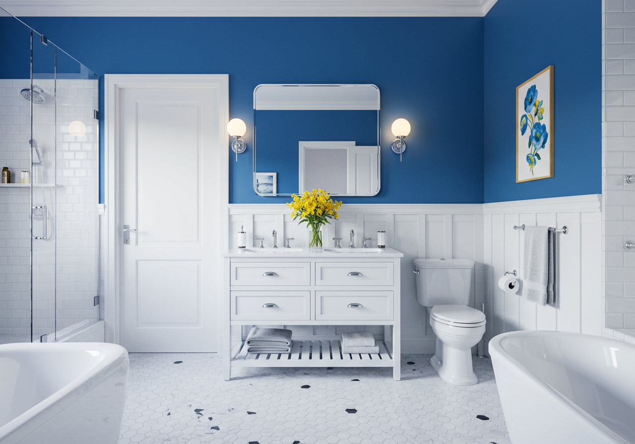While I'm not a fan of the the dark blue paint, I love the wainscoting, the double sink and the adorable circle tile on the floor. Add white subway tile (always a classic and inexpensive) plus a blue and white Spanish inspired accent tile and we're done.