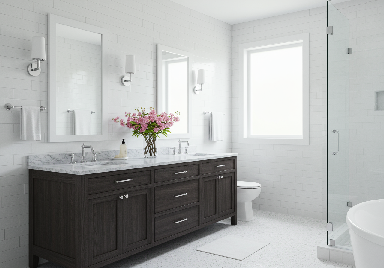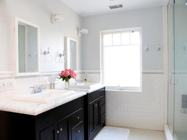 My parents are contemplating making their former office into a bedroom with a full bath. Although this is still in the planning stages, I'm having so much fun brainstorming ideas with them. My favorite part of this process is imagining their bathroom. A double vanity! Subway and accent tile! Heated floors!